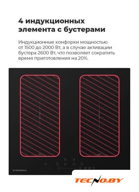 | Подробная информация о конфорках | мощность каждого моста при объединение конфорок 2600/3000 (бустер)верхняя левая 1500/ 2000 (бустер)нижняя левая 2000/2600 (бустер)верхняя правая 2000/2600(бустер)нижняя правая 1500/2000 (бустер) |