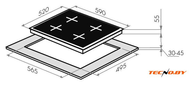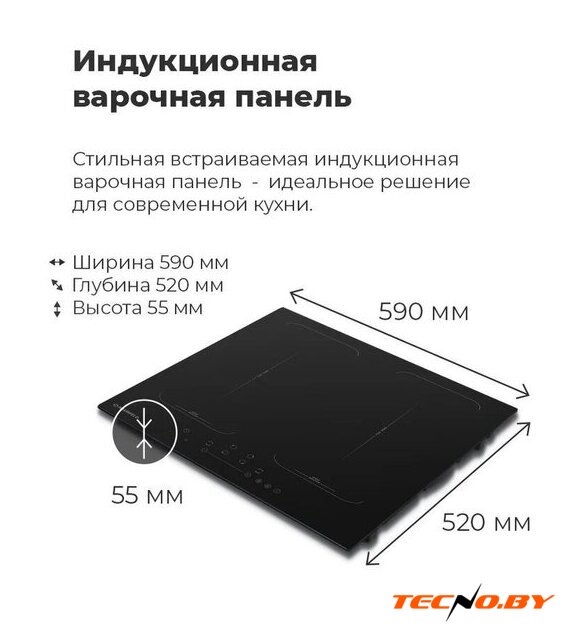 Ширина варочной панели составляет 59 см, а глубина — 52 см, что делает её компактной и удобной для установки на кухне. Для встраивания потребуется ниша шириной 56,5 см и глубиной 49,5 см. Этот прибор представляется как независимый, что делает его универсальным решением для любого кухонного пространства.