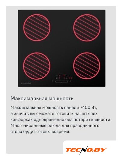 | Подробная информация о конфорках | 4 конфорки мощностью: 2000, 2000, 1500, 1500 Вт |