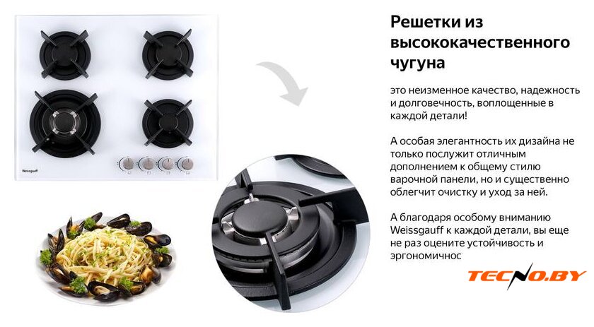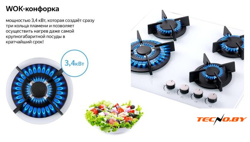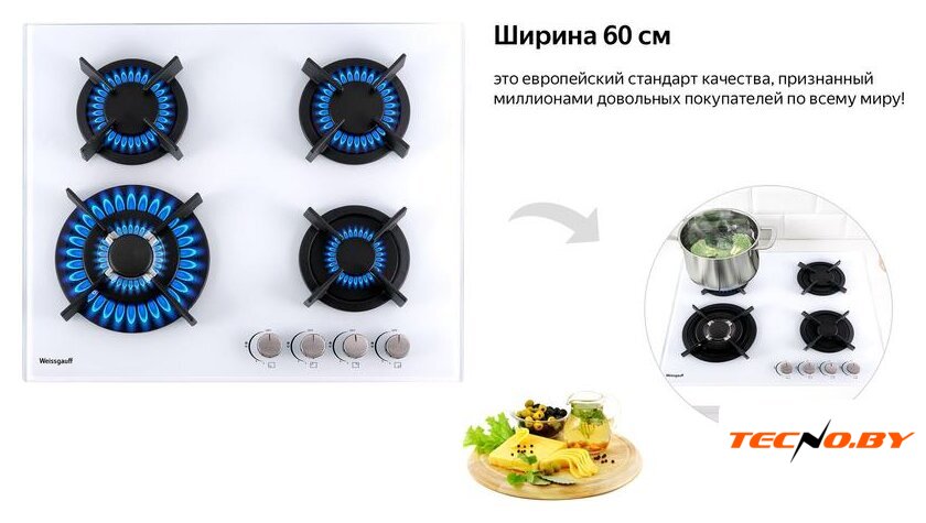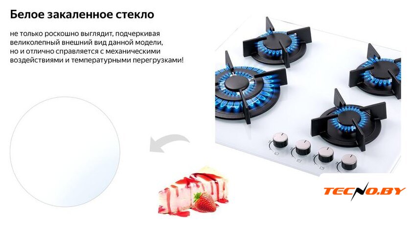 газовая на 4 конфорки, закаленное стекло, мощность: 7400 Вт, автоматический электроподжиг, газ-контроль, решетки: чугун, независимая установка, размеры (ШхГ): 59x51.5 см
