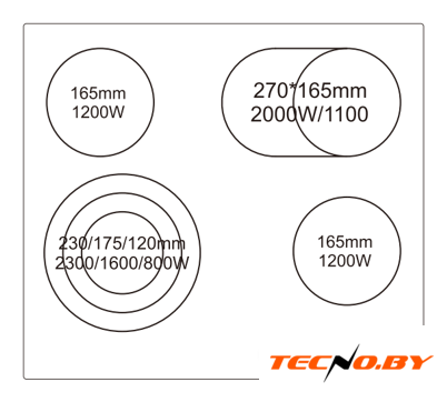 | Подробная информация о конфорках | 2x165 мм (1200 Вт)1x165x270 мм (1100/2000 Вт)1x120-175-230 мм (800-1600-2300 Вт) |