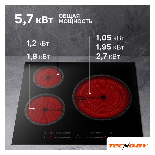 | Подробная информация о конфорках | Ближняя левая 200 мм, 1800WДальняя левая 165 мм, 1200WДальняя правая 150/220/300 мм, 1050/1950/2700W |