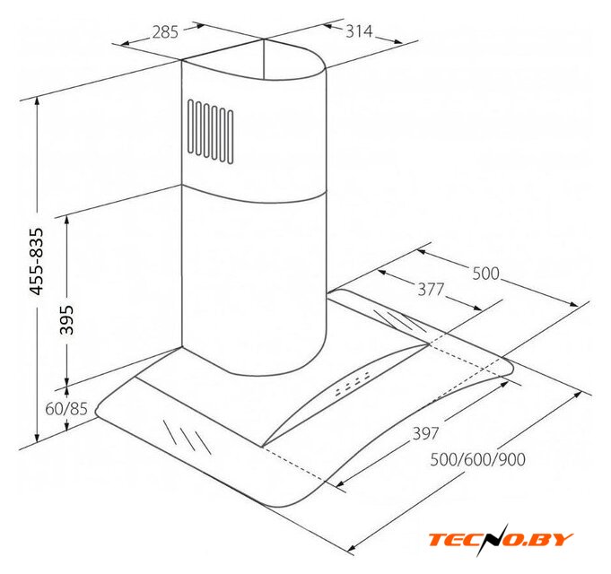конструкция наклонная, монтаж настенный, ширина 50 см, управление механическое/кнопочное, производительность мотора 850 м³/ч, цвет черный