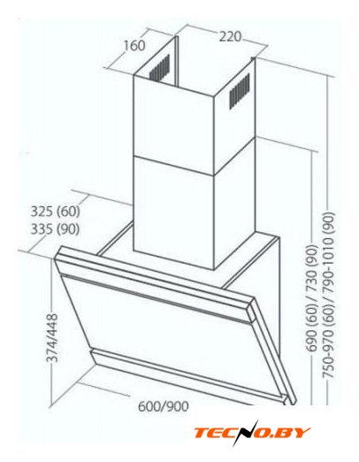 конструкция наклонная, монтаж настенный, ширина 90 см, управление сенсорное, производительность вытяжки 1000 м³/ч, производительность мотора 1000 м³/ч, цвет черный