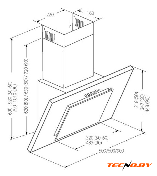 конструкция наклонная, монтаж настенный, ширина 50 см, управление кнопочное, производительность мотора 520 м³/ч, цвет белый
