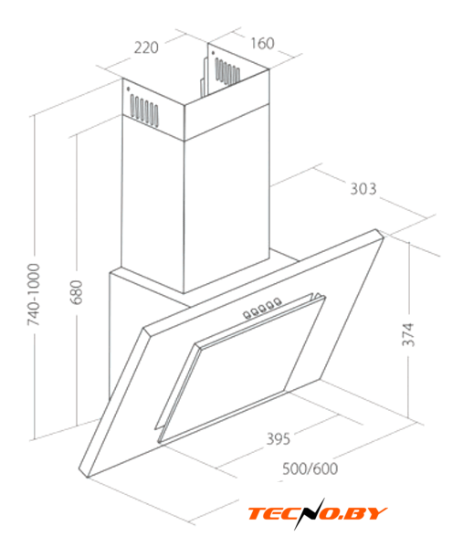 конструкция наклонная, монтаж настенный, ширина 53.8 см, управление сенсорное, производительность вытяжки 1100 м³/ч, производительность мотора 850 м³/ч, цвет черный
