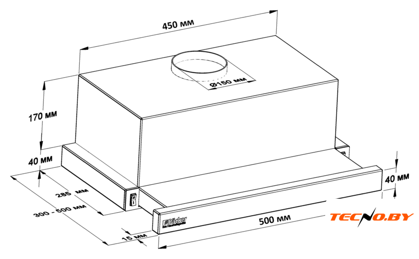 конструкция телескопическая, монтаж для встраивания, ширина 50 см, управление механическое/кнопочное, производительность мотора 600 м³/ч, цвет нержавеющая сталь