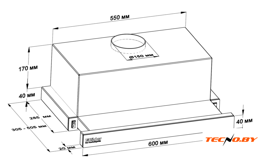 Вытяжка имеет ширину 60 см и глубину 30.5 см (в раздвинутом состоянии — 50.5 см), что делает ее подходящей для большинства кухонных пространств. Высота составляет 21 см, а диаметр воздуховода — 150 мм, что обеспечивает эффективную вентиляцию при правильной установке.