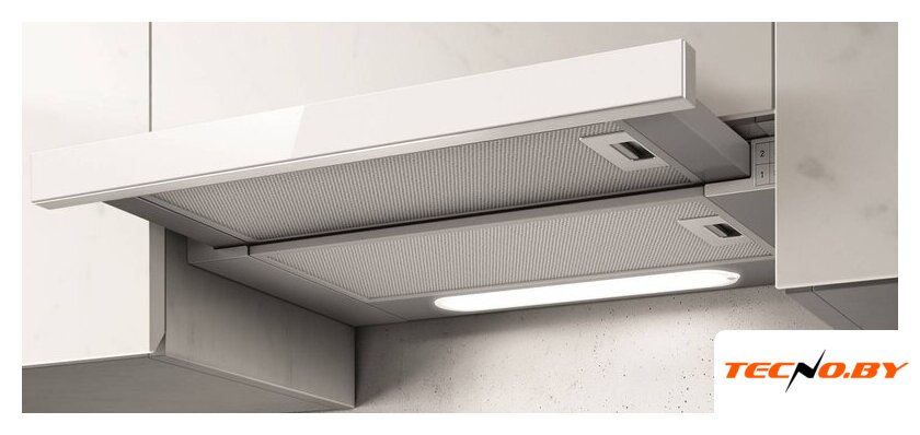 конструкция скрытая, монтаж для встраивания, ширина 53 см, управление кнопочное, производительность мотора 1100 м³/ч, цвет белый