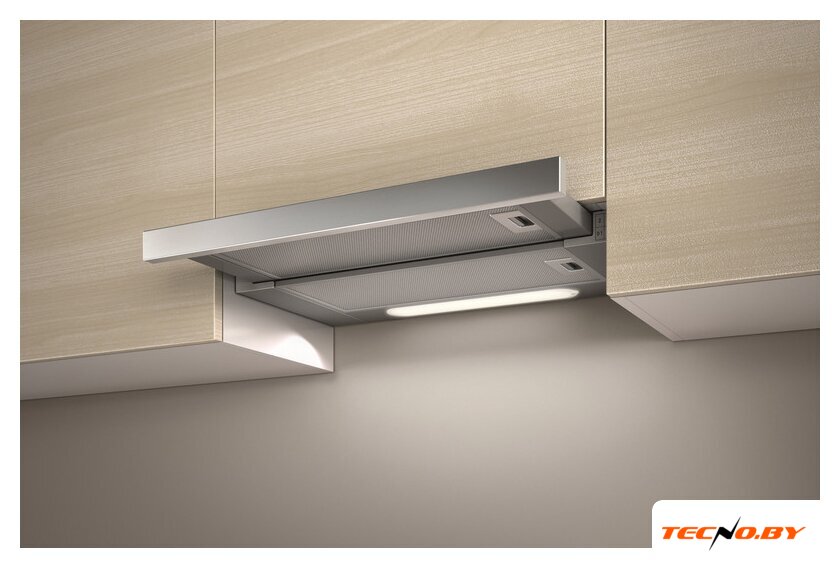 конструкция телескопическая, монтаж для встраивания, ширина 50 см, управление механическое/кнопочное, производительность мотора 750 м³/ч, цвет серый