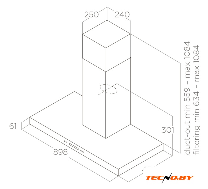 конструкция коробчатая, монтаж настенный, ширина 31 см, управление электронное/кнопочное, производительность мотора 900 м³/ч, цвет черный