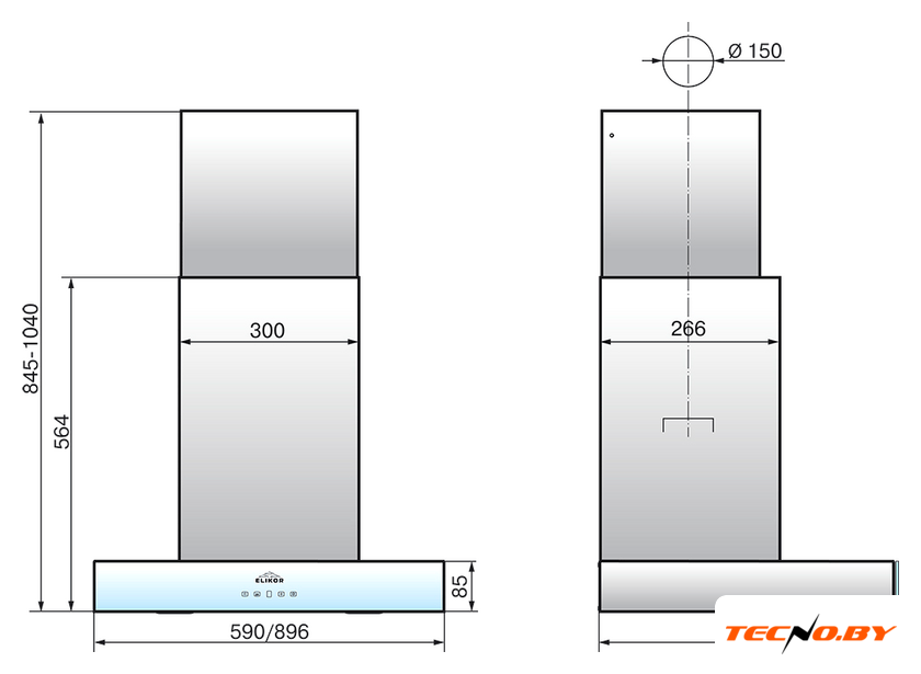 Учитывайте размеры устройства при установке: ширина – 59 см, глубина – 50 см, высота – от 84.5 до 104 см. Вес вытяжки составляет 14 кг, что позволяет легко произвести монтаж на стене. Кроме того, диаметр воздуховода, равный 150 мм, способствует качественному выведению отработанного воздуха.