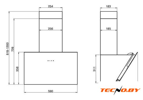 конструкция Т-образная, монтаж настенный, ширина 60 см, управление сенсорное/дистанционное, производительность вытяжки 1100 м³/ч, производительность мотора 950 м³/ч, цвет черный