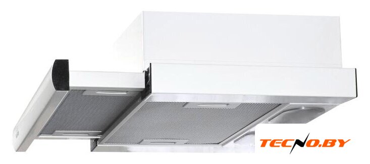 конструкция скрытая, монтаж для встраивания, ширина 50 см, управление механическое/слайдерное, производительность мотора 400 м³/ч, цвет белый
