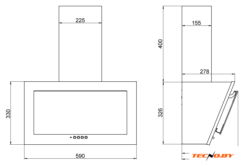 конструкция купольная, монтаж настенный, ширина 60 см, управление механическое/кнопочное, производительность мотора 850 м³/ч, цвет белый