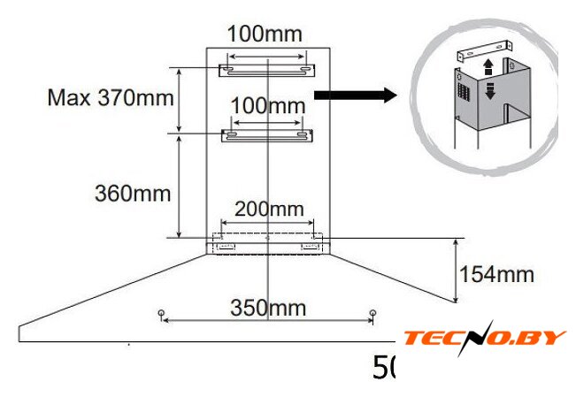 конструкция скрытая, монтаж для встраивания, ширина 52 см, управление механическое/кнопочное, производительность вытяжки 350 м³/ч, производительность мотора 850 м³/ч, цвет белый