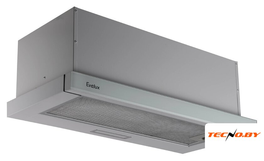 конструкция скрытая, монтаж для встраивания, ширина 42 см, управление механическое/кнопочное, производительность мотора 430 м³/ч, цвет серый/хром