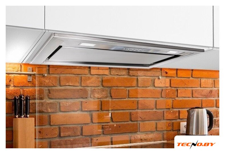 конструкция скрытая, монтаж для встраивания, ширина 59.8 см, управление электронное/кнопочное, производительность мотора 1000 м³/ч, цвет белый