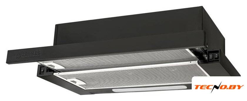 Вытяжка изготовлена из прочной стали и оформлена в элегантном черном цвете. Несмотря на отсутствие периметрального воздухопоглощения, она эффективно справляется со своей задачей благодаря двум алюминиевым жироулавливающим фильтрам. Угольный фильтр доступен как дополнительная опция, что позволяет адаптировать устройство под индивидуальные потребности каждого пользователя.