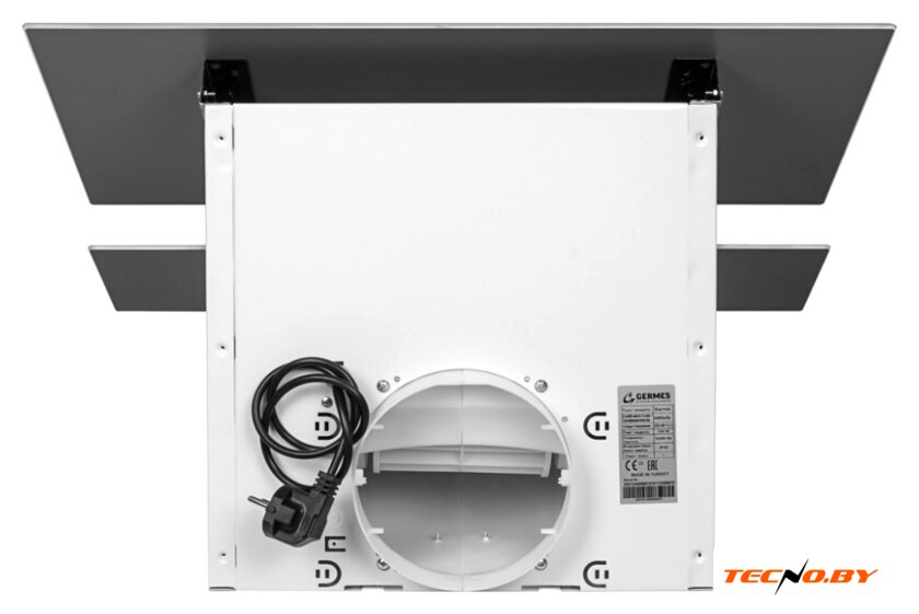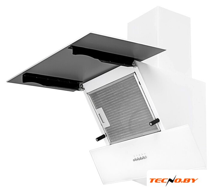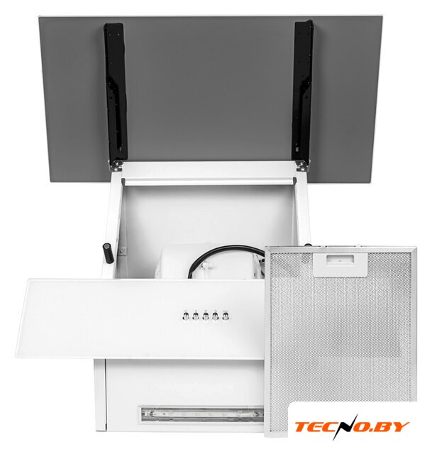 конструкция скрытая, монтаж для встраивания, ширина 59.8 см, управление механическое/кнопочное, производительность мотора 720 м³/ч, цвет белый
