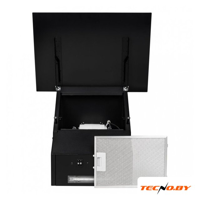 конструкция скрытая, монтаж для встраивания, ширина 52.5 см, управление механическое/кнопочное, производительность мотора 750 м³/ч, цвет черный
