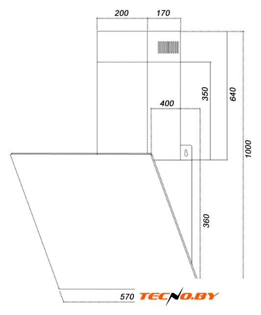 Ширина вытяжки составляет 57 см, глубина – 40 см, а высота регулируется от 72 до 100 см, что делает её подходящей для большинства современных кухонь. Диаметр воздуховода составляет 120 мм, что позволяет использовать стандартные вентиляционные системы.