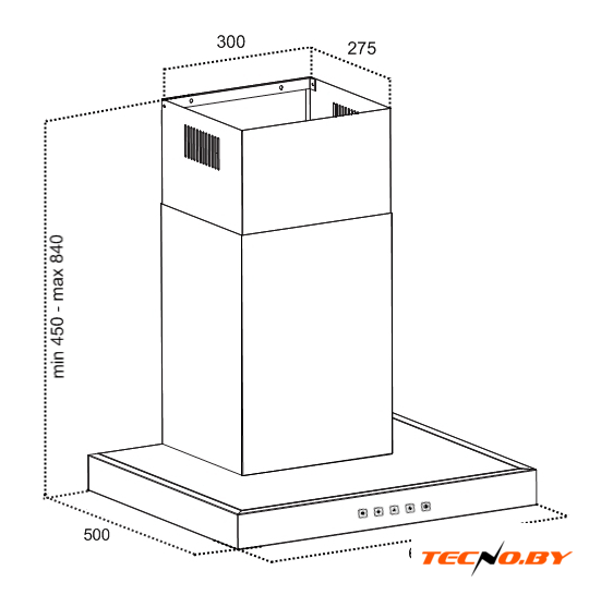 конструкция Т-образная, монтаж настенный, ширина 89.6 см, управление механическое/кнопочное, производительность мотора 650 м³/ч, цвет белый