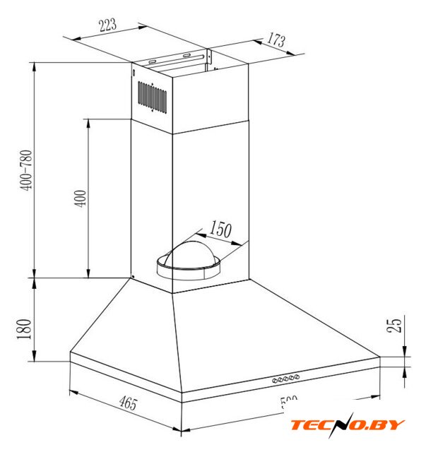 Ширина вытяжки составляет 50 см, глубина – 46.5 см, а высота – 58 см, что делает ее идеальным выбором для кухонь даже с ограниченным пространством. Диаметр воздуховода — 150 мм, что обеспечивает оптимальную вентиляцию.