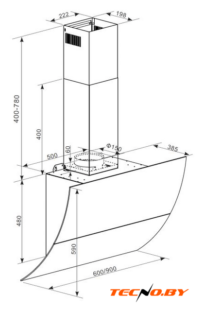 При ширине 90 см, глубине 38.5 см и высоте от 99 до 137 см, данная вытяжка компактна и легко монтируется на стену. Диаметр воздуховода в 150 мм обеспечивает эффективное удаление воздуха, делая Graude DH 90.3 WE идеальным выбором для большинства кухонь.