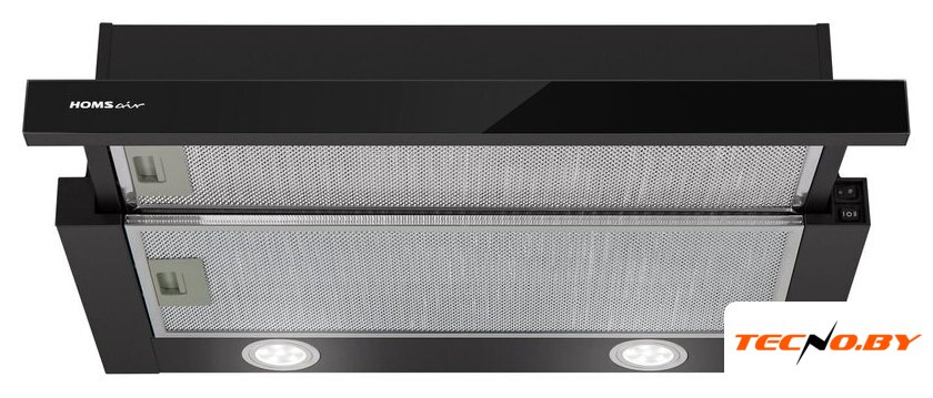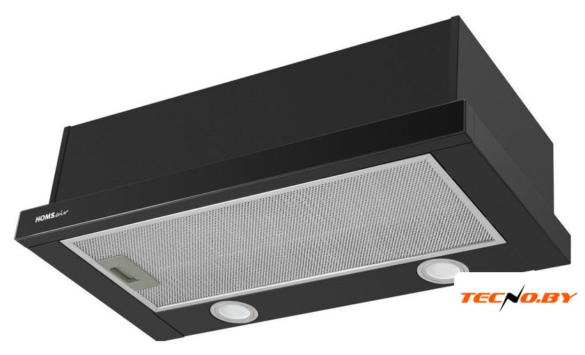 конструкция телескопическая, монтаж для встраивания, ширина 59.8 см, управление механическое/кнопочное, производительность мотора 320 м³/ч, цвет черный
