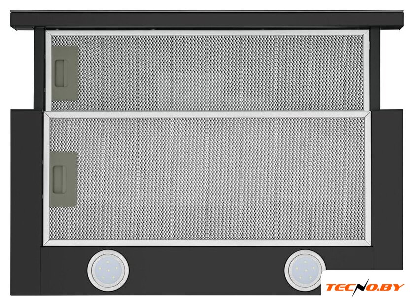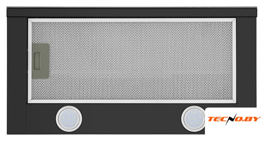 конструкция скрытая, монтаж для встраивания, ширина 53 см, управление механическое/кнопочное, производительность мотора 520 м³/ч, цвет черный