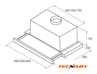 конструкция Т-образная, монтаж настенный, ширина 89.6 см, управление механическое/кнопочное, производительность мотора 650 м³/ч, цвет белый