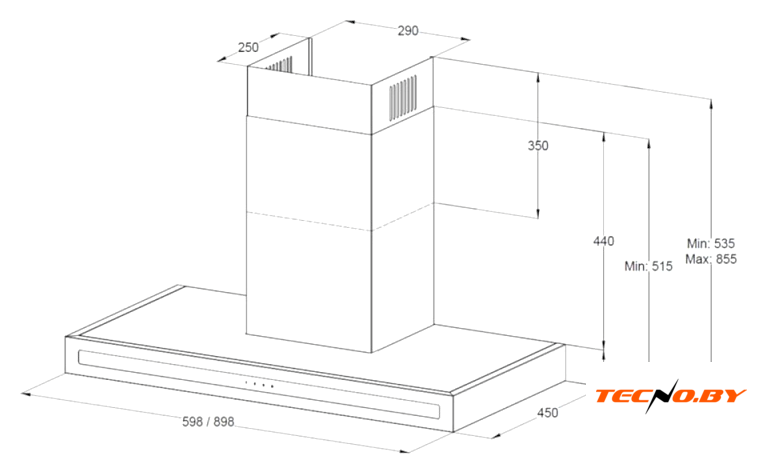 конструкция коробчатая, монтаж настенный, ширина 35 см, управление электронное/кнопочное, производительность вытяжки 350 м³/ч, производительность мотора 900 м³/ч, цвет черный
