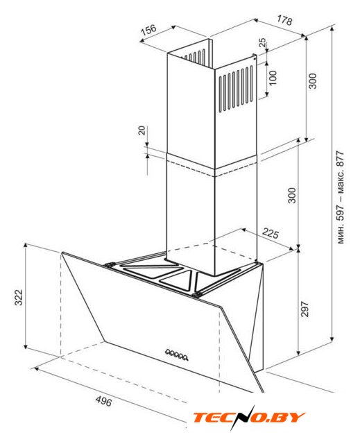 конструкция скрытая, монтаж для встраивания, ширина 59.8 см, управление механическое/кнопочное, производительность мотора 850 м³/ч, цвет нержавеющая сталь