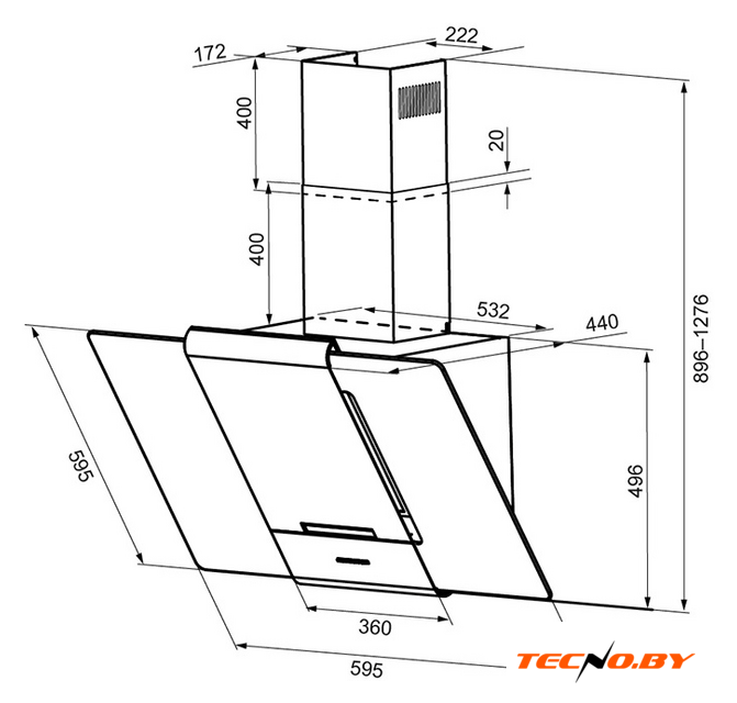 конструкция наклонная, монтаж настенный, ширина 59 см, управление электронное/сенсорное, производительность мотора 700 м³/ч, цвет белый
