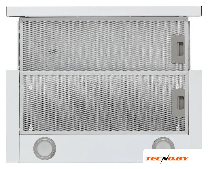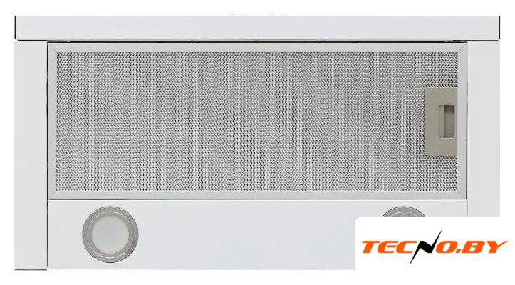 конструкция Т-образная, монтаж настенный, ширина 59 см, управление механическое/кнопочное, производительность мотора 430 м³/ч, цвет белый