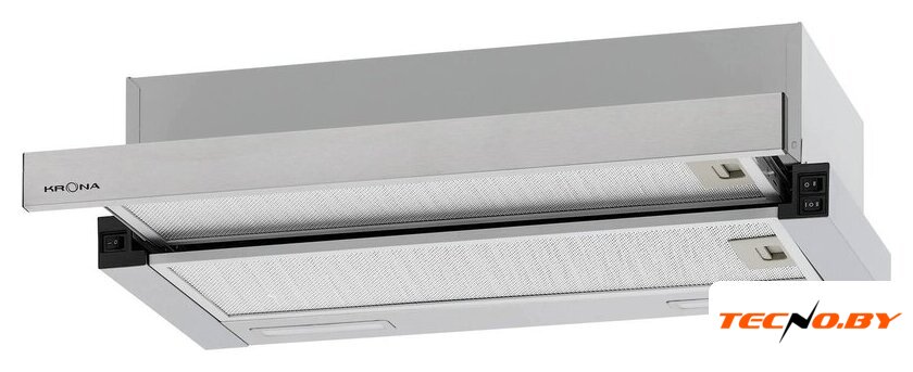 конструкция телескопическая, монтаж для встраивания, ширина 49.5 см, управление механическое/кнопочное, производительность мотора 600 м³/ч, цвет белый/нержавеющая сталь