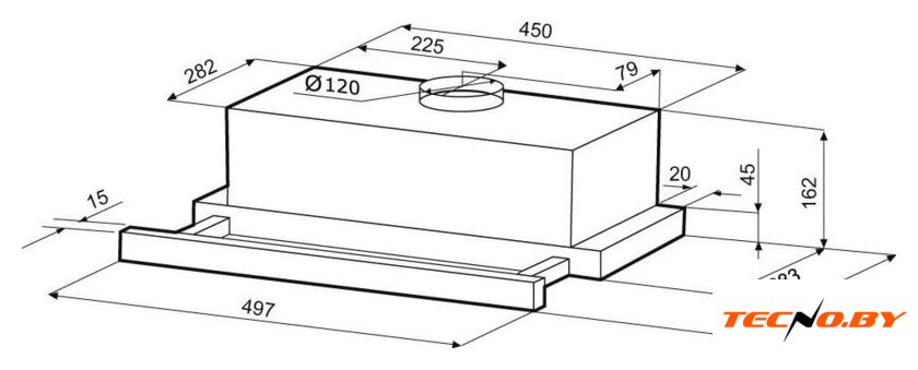 конструкция телескопическая, монтаж для встраивания, ширина 45 см, управление механическое/кнопочное, производительность мотора 400 м³/ч, цвет белый/нержавеющая сталь
