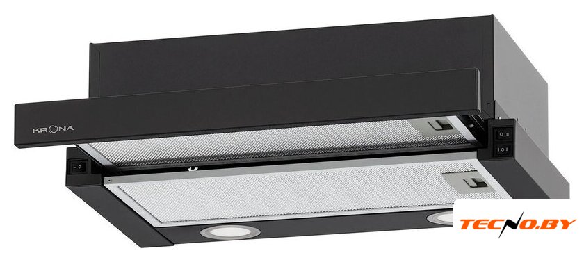 конструкция телескопическая, монтаж для встраивания, ширина 60 см, управление механическое/кнопочное, производительность мотора 400 м³/ч, цвет нержавеющая сталь/черный