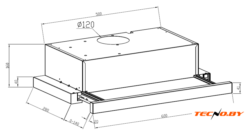 конструкция телескопическая, монтаж для встраивания, ширина 60 см, управление механическое/кнопочное, производительность мотора 850 м³/ч, цвет черный