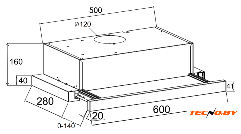 конструкция скрытая, монтаж для встраивания, ширина 59.8 см, управление механическое/кнопочное, производительность мотора 500 м³/ч, цвет хром