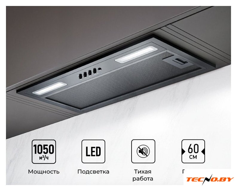 конструкция наклонная, монтаж настенный, ширина 60 см, управление сенсорное, производительность мотора 550 м³/ч, цвет черный