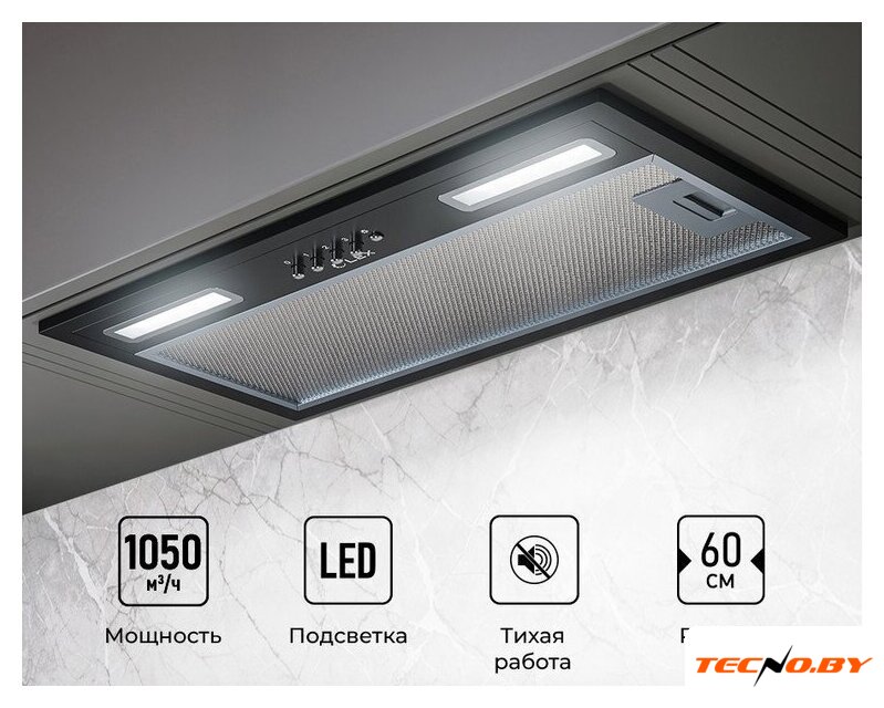 конструкция купольная, монтаж настенный, управление механическое/слайдерное, производительность мотора 650 м³/ч, ширина 59 см