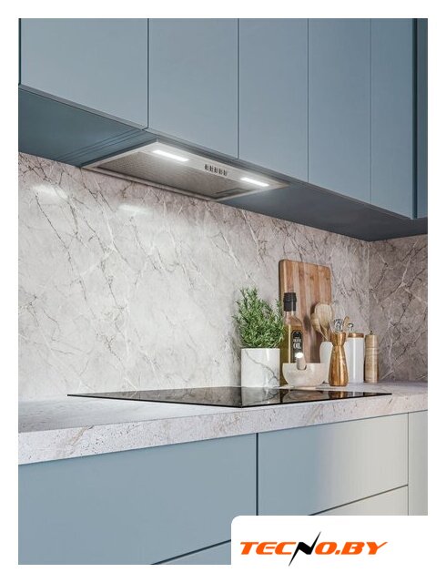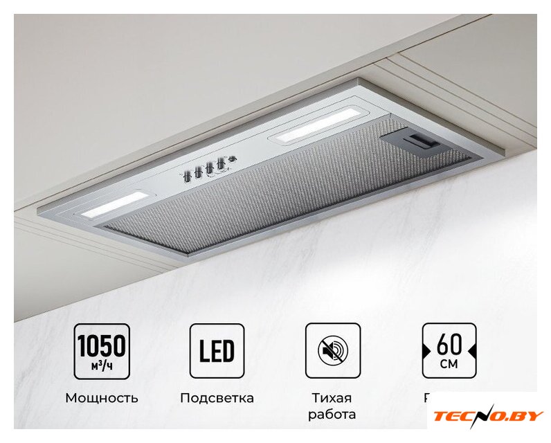 конструкция наклонная, монтаж настенный, ширина 59.5 см, управление механическое/кнопочное, производительность вытяжки 600 м³/ч, производительность мотора 900 м³/ч, цвет белый