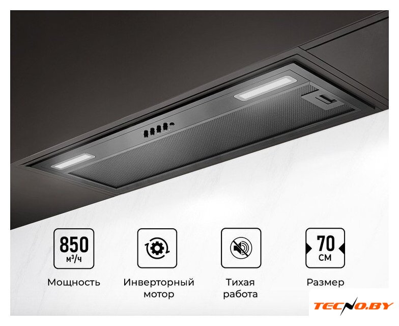 конструкция скрытая, монтаж для встраивания, ширина 60 см, управление механическое/кнопочное, производительность мотора 900 м³/ч, цвет черный