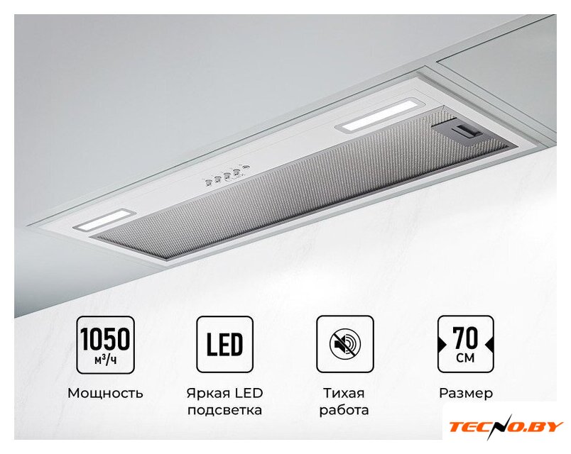 конструкция наклонная, монтаж настенный, ширина 59.8 см, управление сенсорное/дистанционное, производительность мотора 950 м³/ч, цвет белый