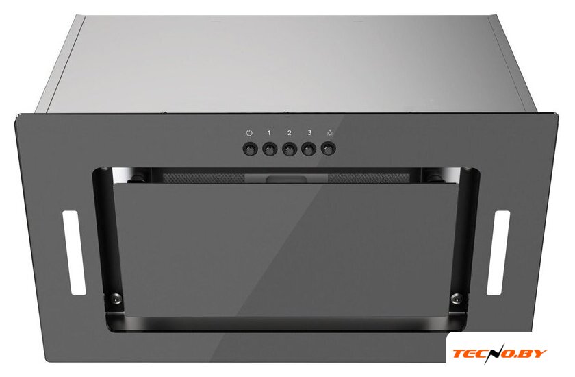 конструкция скрытая, монтаж для встраивания, ширина 73 см, управление механическое/кнопочное, производительность мотора 1100 м³/ч, цвет черный