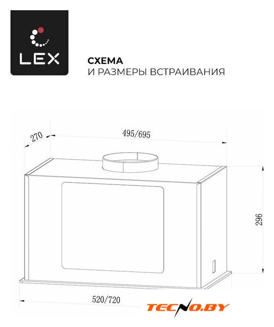 конструкция скрытая, монтаж для встраивания, ширина 55 см, управление механическое/кнопочное, производительность мотора 720 м³/ч, цвет белый
