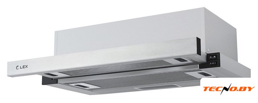 конструкция телескопическая, монтаж для встраивания, ширина 50 см, управление механическое/кнопочное, производительность мотора 550 м³/ч, цвет нержавеющая сталь