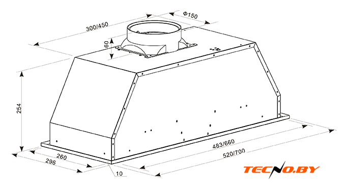 монтаж настенный, ширина 60 см, управление кнопочное, производительность вытяжки 600 м³/ч
